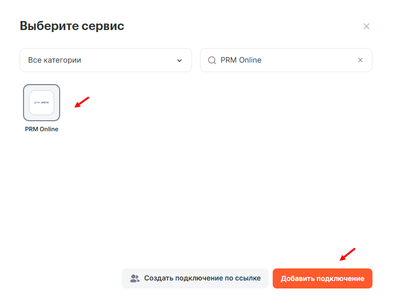 Для создания подключения перейдём в профиль Albato и в разделе подключений найдём сервис PRM Online