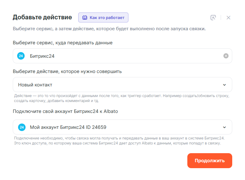 Следующим шагом выберем действие Б24: Новый контакт