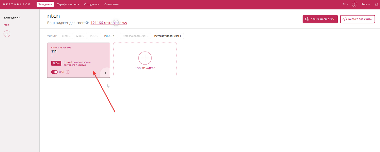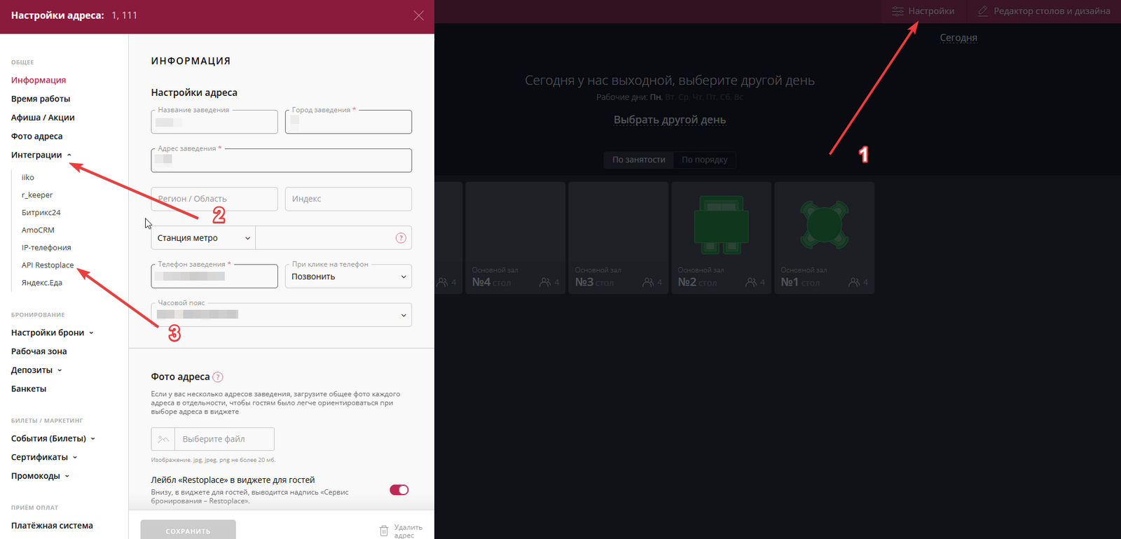 Далее, в правом верхнем углу нажмите кнопку «Настройки» (1). В левой части экрана выберите раздел «Интеграции», «API Restoplace»
