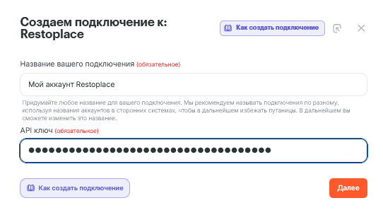 Скопированный ранее API-ключ из настроек сервиса Restoplace укажите в поле «API ключ». Нажмите на кнопку «Далее».