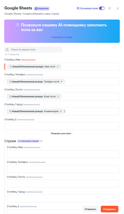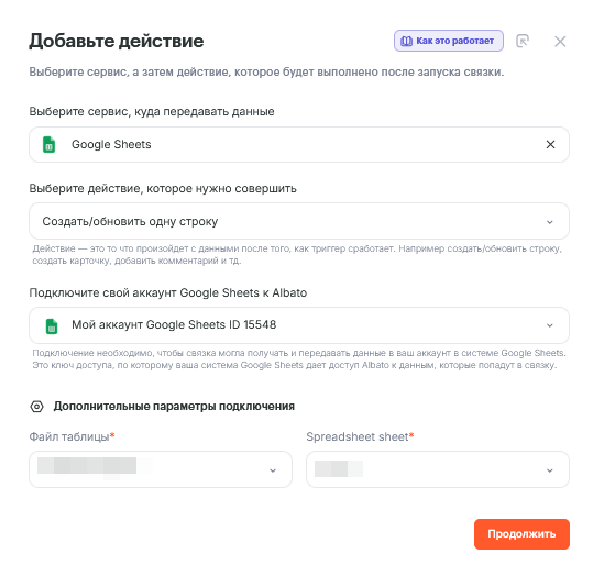 - Какое действие выполнить, когда запустится связка — Создать/обновить одну строку