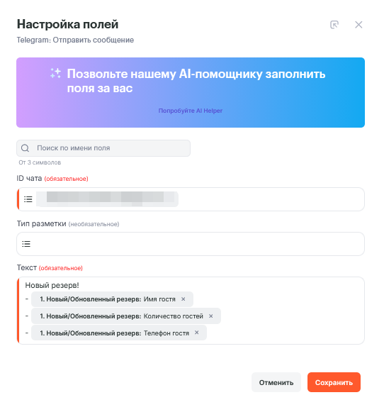 Заполните поля «ID чата» и «Текст» необходимыми данными. Нажмите кнопку «Сохранить»