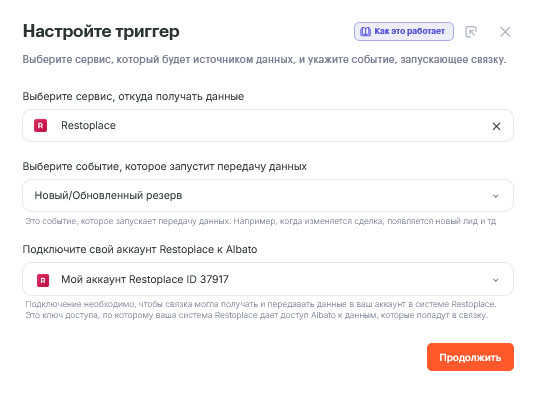 Через интеграцию с данным сервисом можно получать информацию о новых и обновленных резервах или, наоборот, передавать информацию в Restoplace.