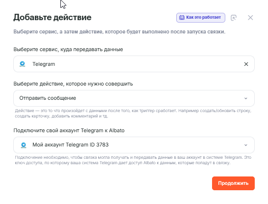 Действия — что делает Albato после запуска связки. Также действия позволяют передавать данные в другие сервисы и системы.