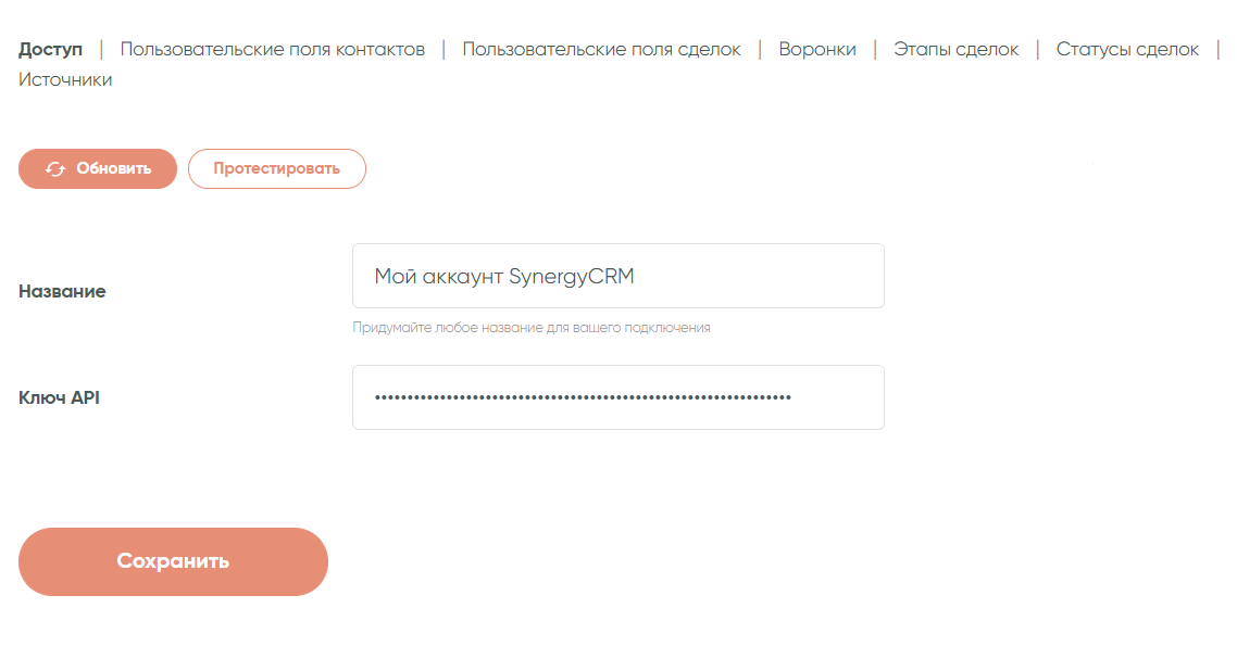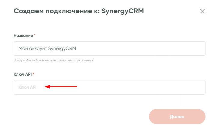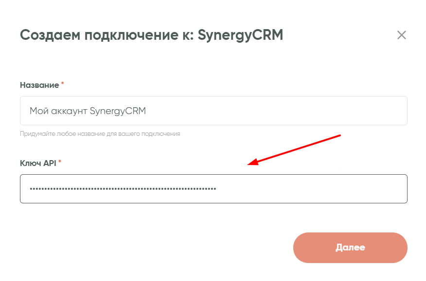 В следующем шаге необходимо будет задать название подключения и внести в соответствующее поле ключ API. Его можно найти в настройках самой CRM, а потом скопировать в поле, как показано на скриншоте ниже: