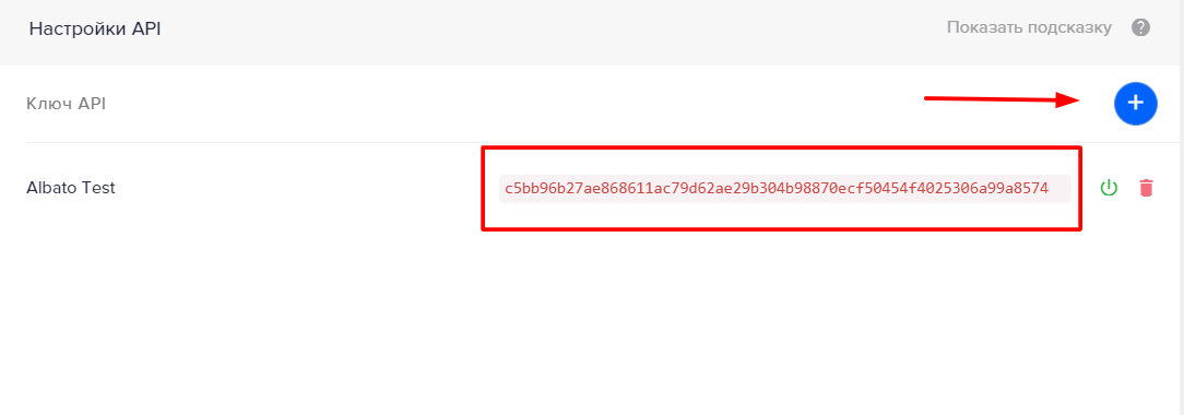 Нажав на кнопку, отмеченную стрелкой, задайте имя для API-ключа. Сервис сгенерирует символьное значение. Скопируйте значение в Albato.