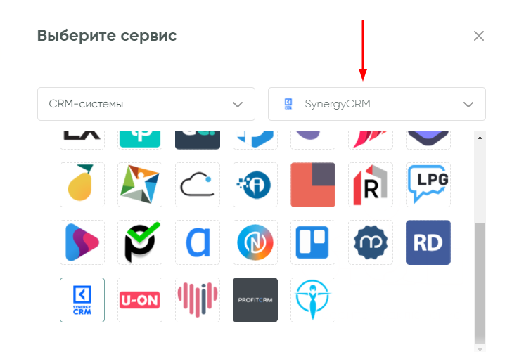 В новом окне можно выбрать в левом выпадающем списке категорию CRM-систем или воспользоваться поиском в правой колонке, чтобы выбрать SynergyCRM из списка сервисов.