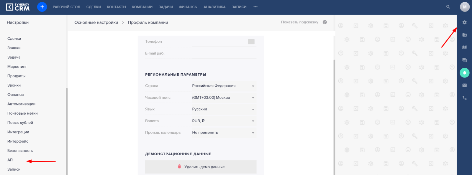 Значение API берем из самого сервиса. Для этого заходим в настройки в правой панели и ищем раздел API в левой части, как показывают стрелки.