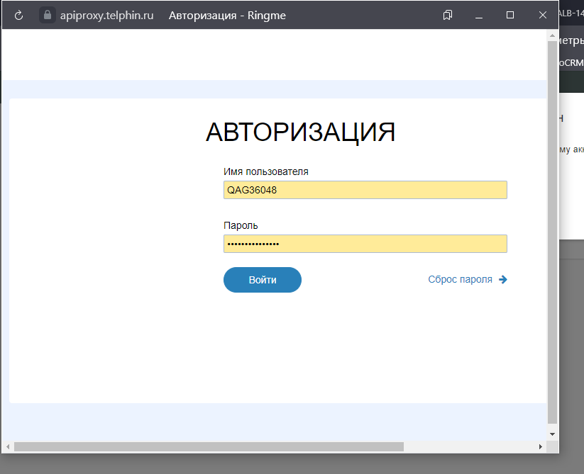 В открывшемся окне заполните ваш логин и пароль от телефонии Телфин и нажмите кнопку «Войти»: