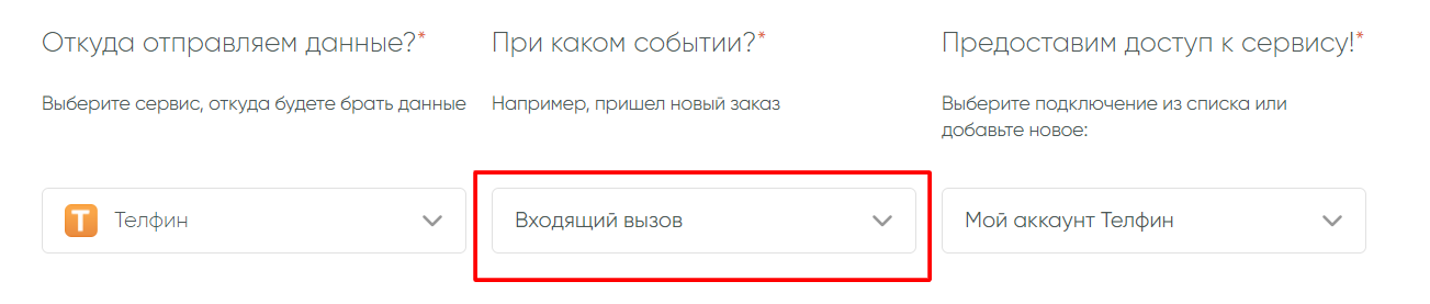 При создании новой связки выберите сервис, откуда будете получать данные — Телфин, и триггер, при срабатывании которого, данные будут передаваться, например, в amoCRM или другой нужный сервис.