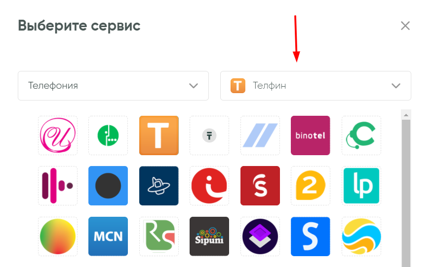 Для создания подключения откройте закладку «Подключения» -> «Добавить подключение». На новом экране выберите категорию «Телефония» или воспользуйтесь поисковой строкой и в выпадающем меню выберите сервис Телфин:
