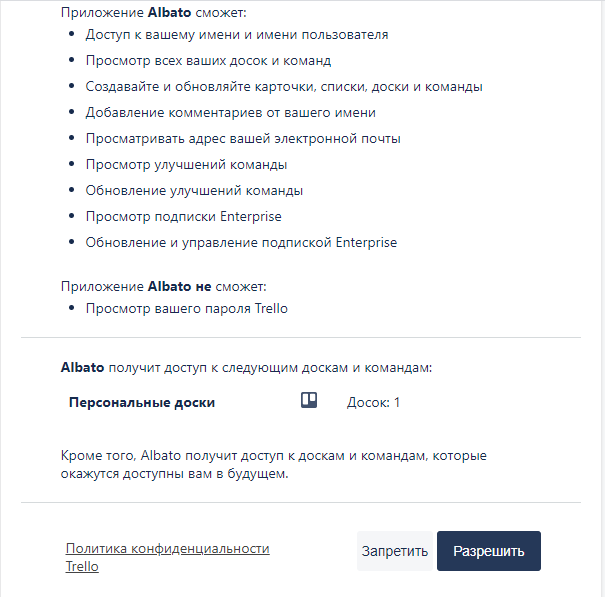 Также можно передавать данные в Trello, выполнив перечисленные действия: