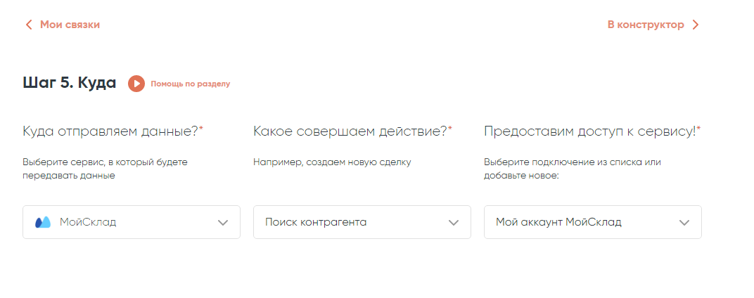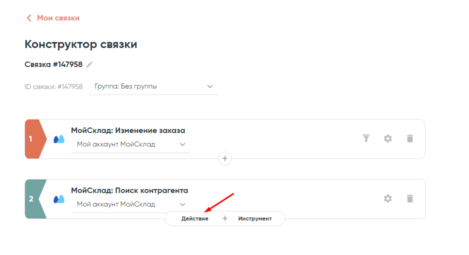 Если номер телефона контрагента лежит в карточке заказа «МойСклад», этот шаг нужно пропустить. Но чаще этот параметр находится в карточке контрагента, поэтому следующий шаг будет — «Поиск контрагента в МойСклад»: