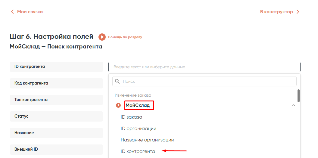 Переходим к настройке. Нам нужно заполнить только одно поле ID контрагента из списка значений шага 1 «МойСклад — изменение заказа».
