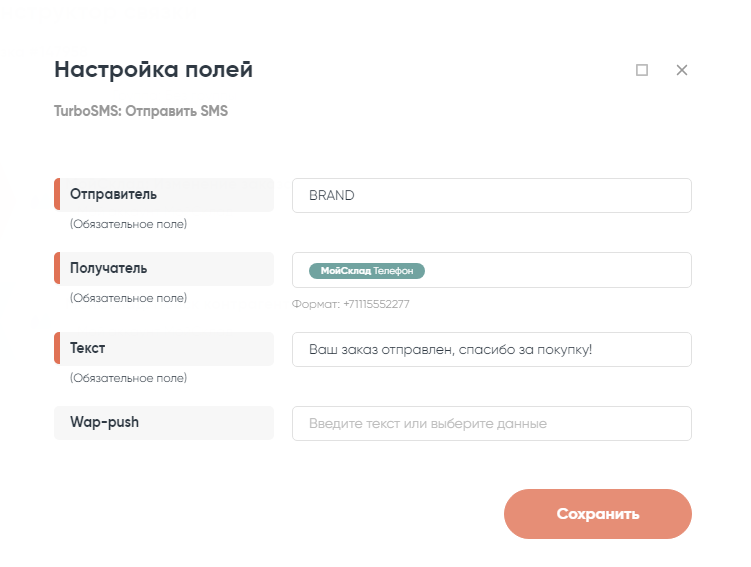 - Получатель. Значение «Телефон» из списка шага №2 «Поиск контрагента в МойСклад».