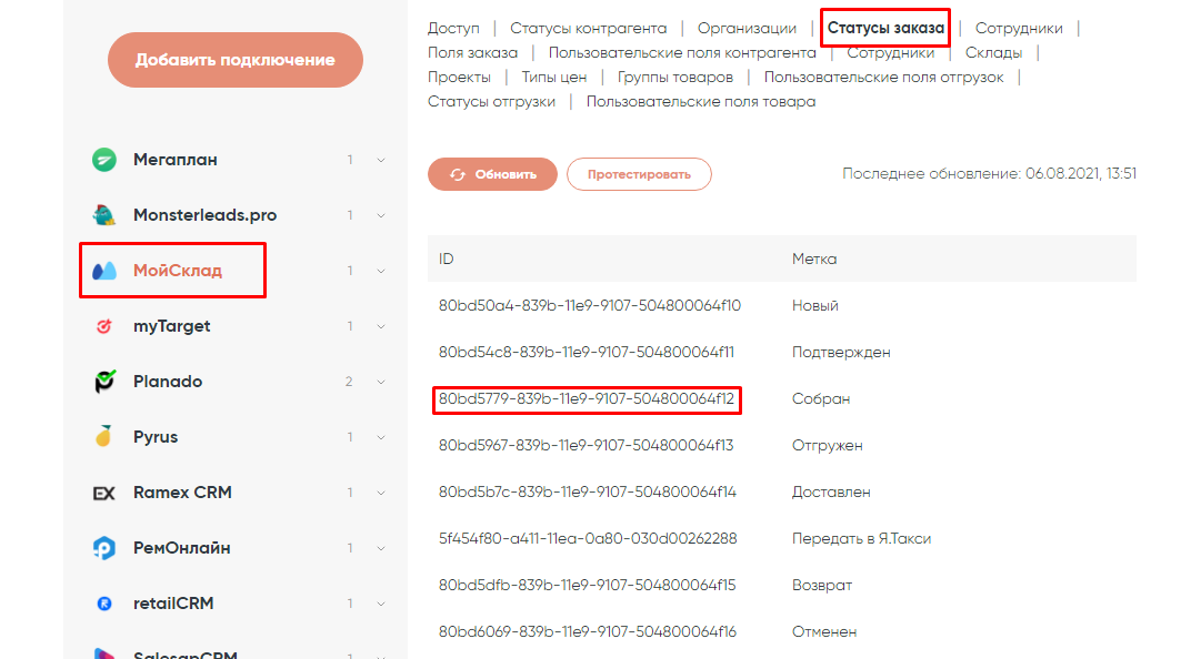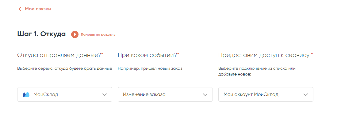 Мы создали подключение. Теперь переходим к настройке связки, которая будет выполнять следующий сценарий: отправлять SMS клиенту, при переходе на определенный статус заказа в «МойСклад». В нашем случае статус заказа будет «Собран».