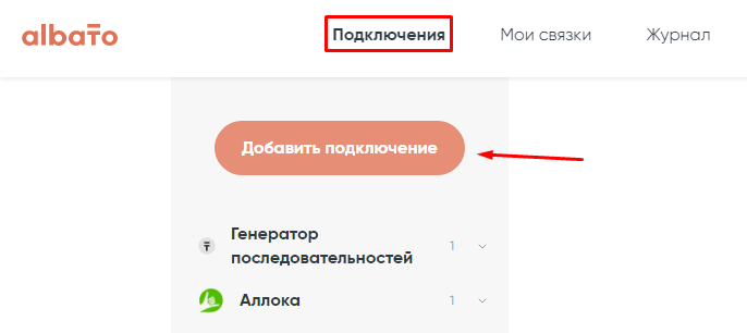 Чтобы пользоваться сервисом для рассылки SMS, его нужно подключить к Albato. Для этого переходим в раздел «Подключения» и «Добавить»: