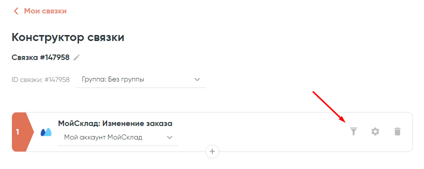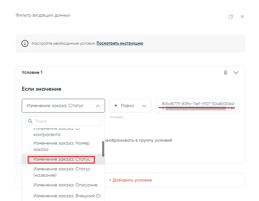 В нашем сценарии нужно отправлять SMS только при статусе заказа «Собран», поэтому возвращаемся в связку, к настройке фильтрации входящих данных.