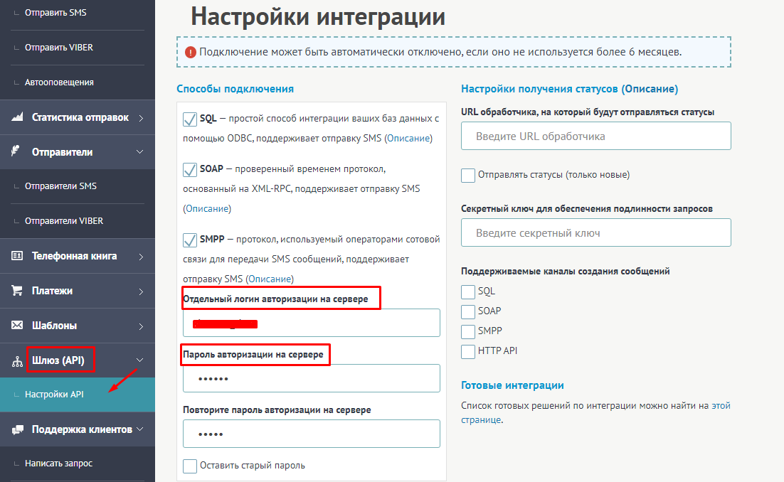 - Прокси-логин и Прокси пароль. Их можно найти в личном кабинете TurboSMS, в разделе «Шлюз API» — «Настройки API», копируем каждый параметр отдельно и вставляем в соответствующее поле «Подключения TurboSMS» в Albato.