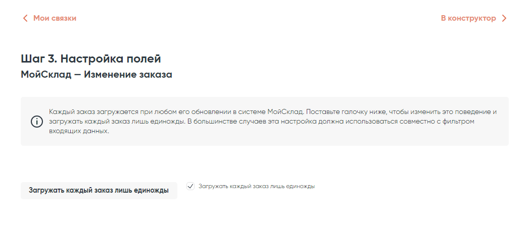 В следующем шаге система предлагает варианты отправки данных, мы будем загружать каждый заказ только один раз, поэтому ставим галочку в чек-боксе.