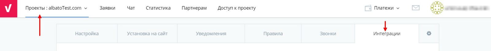Переходим в личный кабинет Venyoo → «Проекты: «актуальный проект»» → «Интеграции»: