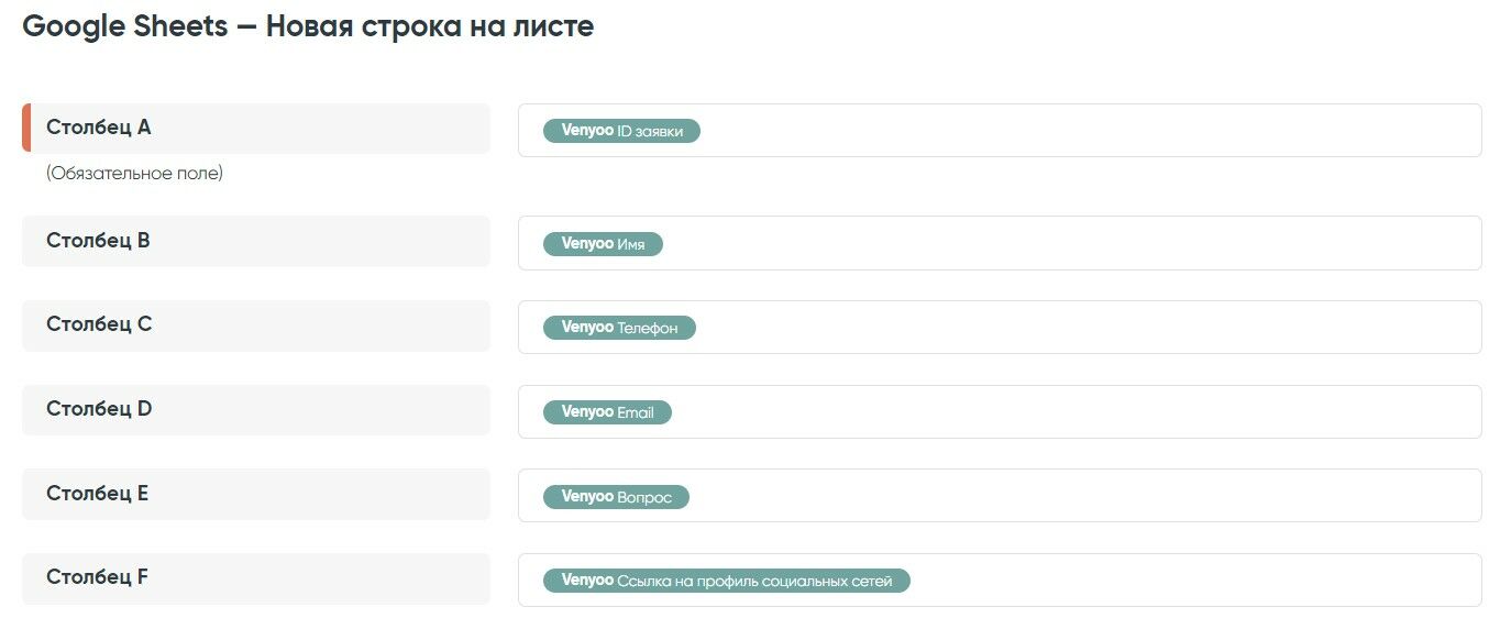 Указываем, в какую ячейку новой строки какую информацию из Venyoo передавать.