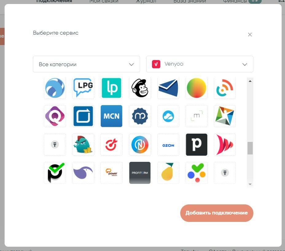Чтобы создавать связки с другими сервисами, необходимо подключить Venyoo к Albato. В разделе «Подключения» нажимаем «Добавить подключение»: