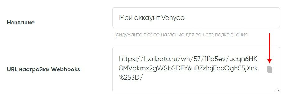После создания подключения мы попадаем в его настройки, где нам потребуется скопировать ссылку из поля «URL настройки Webhooks»: