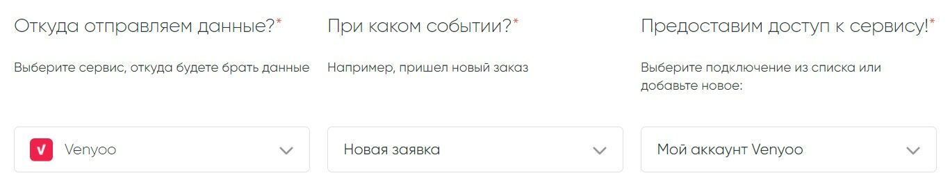 В качестве сервиса «Откуда» в первом выпадающем списке выбираем Venyoo, событие — «Новая заявка» и актуальное подключение: