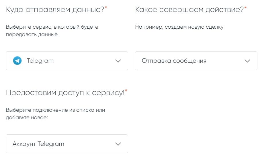 Выбираем сервис Telegram, действие — «Отправка сообщения» и подключение к мессенджеру: