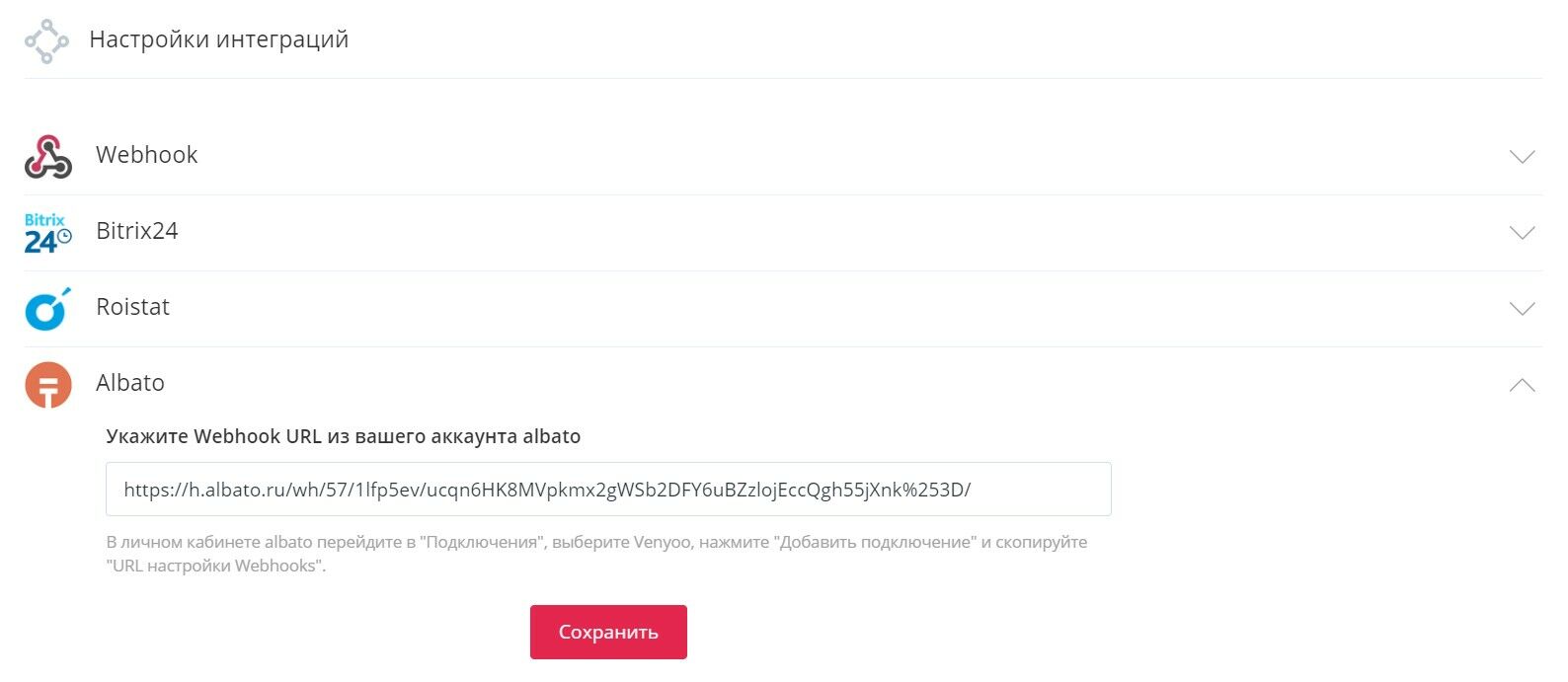 Прокручиваем страницу до раздела «Интеграция», разворачиваем блок «Albato» и в поле для Webhook вставляем скопированную ранее ссылку: