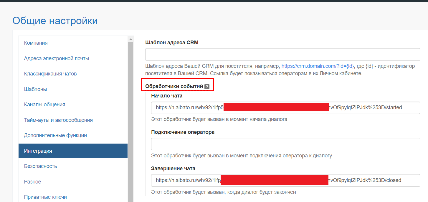Кликните по вкладке «Обработчик событий» и вставьте первый вебхук, скопированный из Albato в поле «Начало чата». Обратите внимание, что нужный для это поля вебхук для поля «Начало чата» будет заканчиваться /started — по этому признаку можно проверить корректность полей. Вернемся в Albato и скопируем второй вебхук. Вставим его в поле «Завершение чата». Адрес нужного вебхука для этого поля всегда будет заканчиваться на /closed.