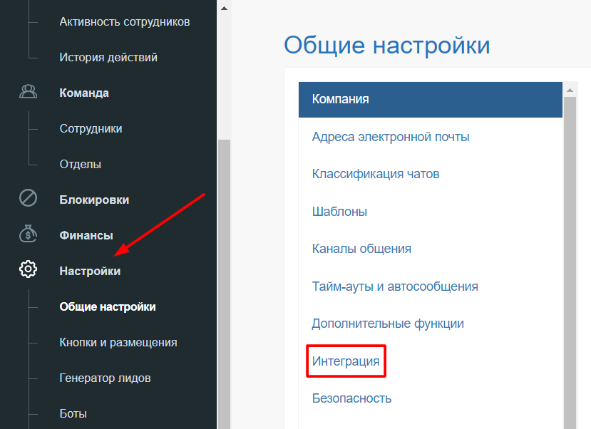 Зайдем в «Общие настройки» и перейдем в раздел «Интеграции».