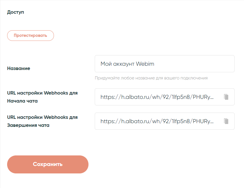 На этом этапе система Albato сгенерирует для вас два вебхука, которые подходят разным событиям. Скопируем первое значение (вебхук начала чата) и откроем сервис Webim (настройки Albato пока не закрываем, позже нам понадобится второй вебхук.