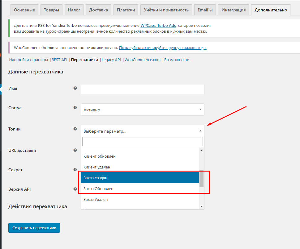Задайте имя перехватчика, установите статус «Активно» и в поле «Топик» выберите событие «Заказ создан» или «Заказ обновлен». Если вам нужны оба события, создайте два перехватчика, выбрав в одном топик «Заказ создан», а во втором — «Заказ обновлен». URL доставки при этом будет одинаковый: