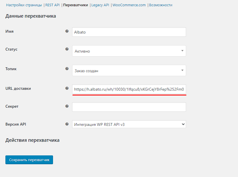 В поле «URL доставки» вставьте скопированный вебхук и нажмите кнопку «Сохранить перехватчик»: