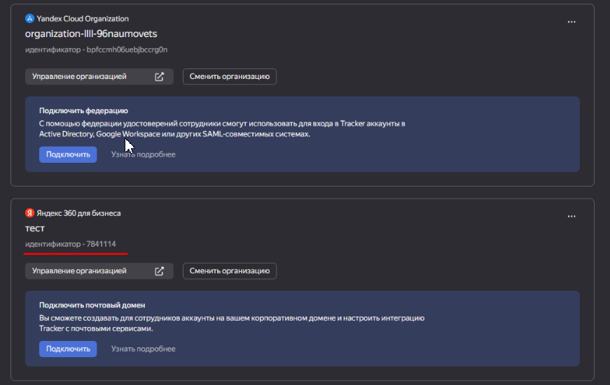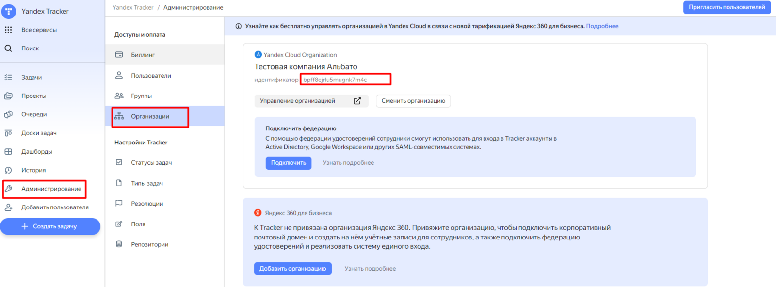 Войди в свою учетную запись Яндекс Трекера → раздел Администрирование → Организации