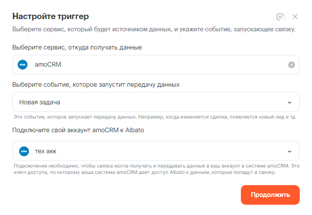 - Сервис, из которого будете передавать данные — Amo Crm.