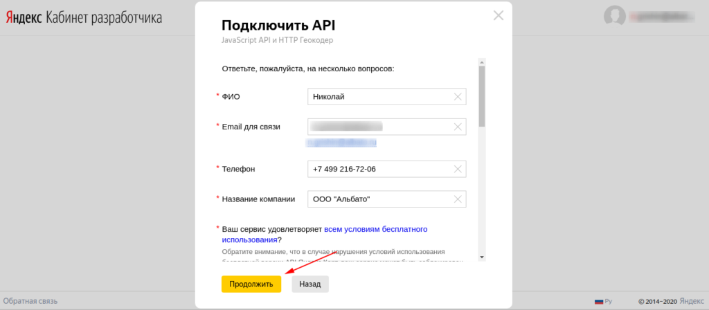 Зайдите на страницу Кабинета Разработчика и нажмите кнопку «Подключить API». Во всплывающем окне выберите сервис «JavaScript API и HTTP Геокодер».