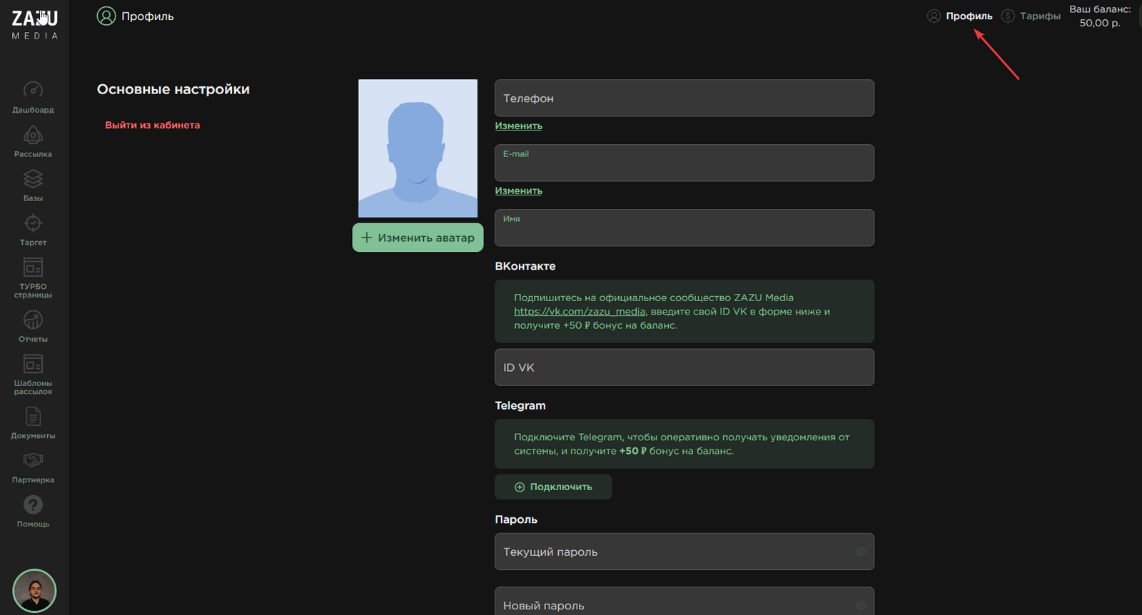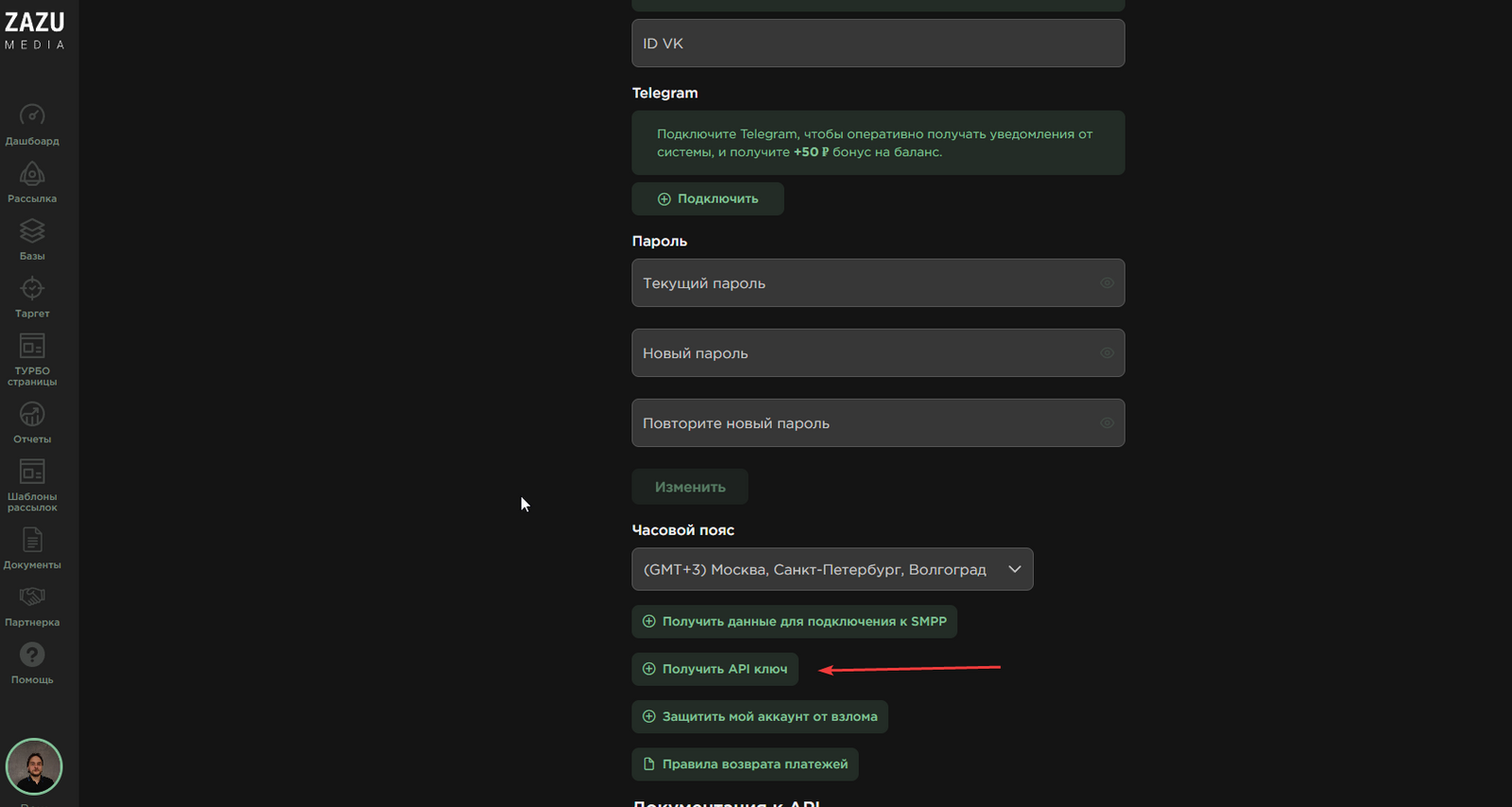 Для получения API ключа перейдите в раздел Профиль в Zazumedia