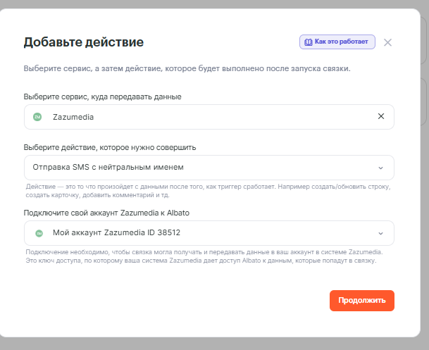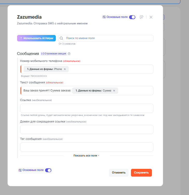 Вторым шагом добавим действие Zazumedia: Отправка SMS с нейтральным именем