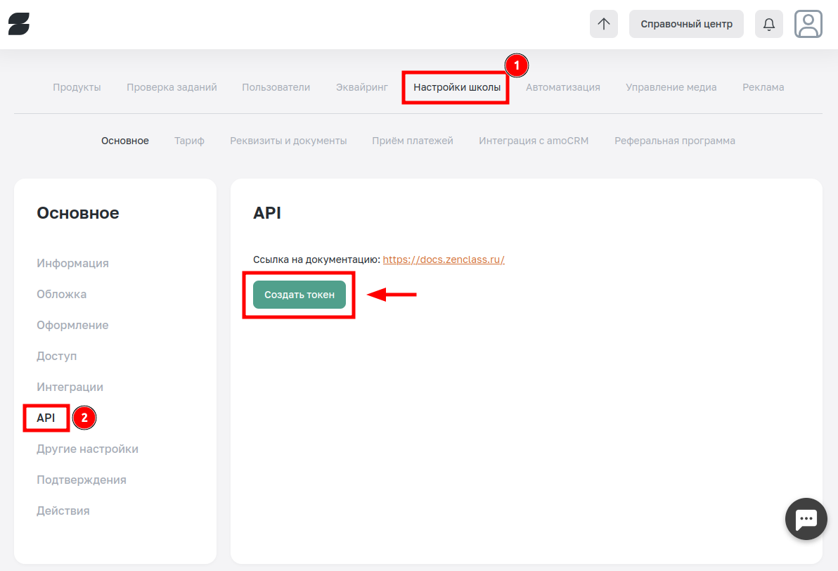 Для этого заходим в меню Настройки школы → API → Создать токен.