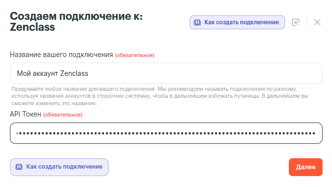 В поле API Токен вставляем скопированный токен из Zenclass и нажимаем Далее.
