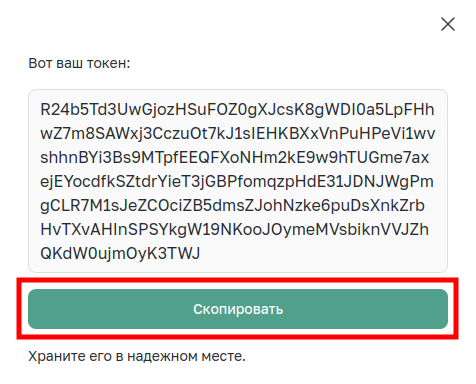 Появится всплывающее окно, из которого нужно скопировать сгенерированный токен.