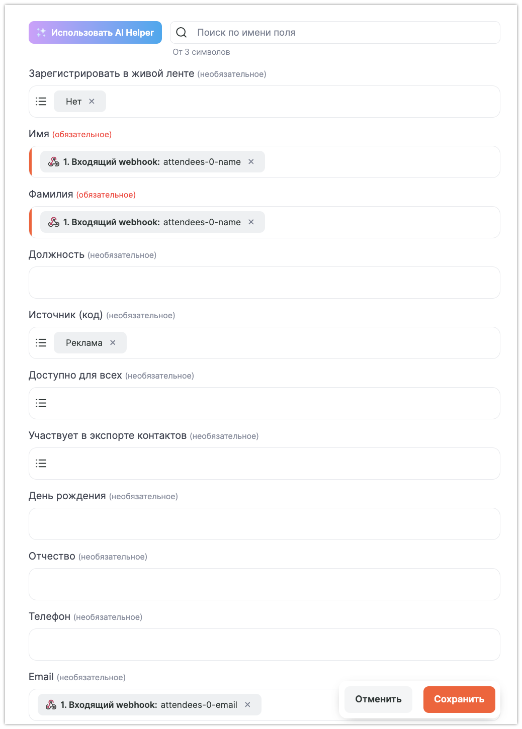 Заполняем поля в шаге нужными параметрами с вебхука. Пример заполненного шага: