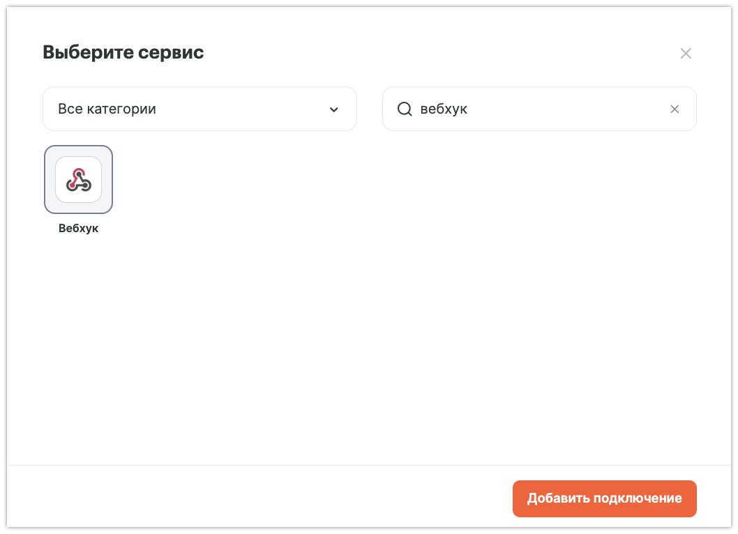Для этого нужно перейти во вкладку “Подключения” — “Добавить подключение” и найти сервис Webhook: