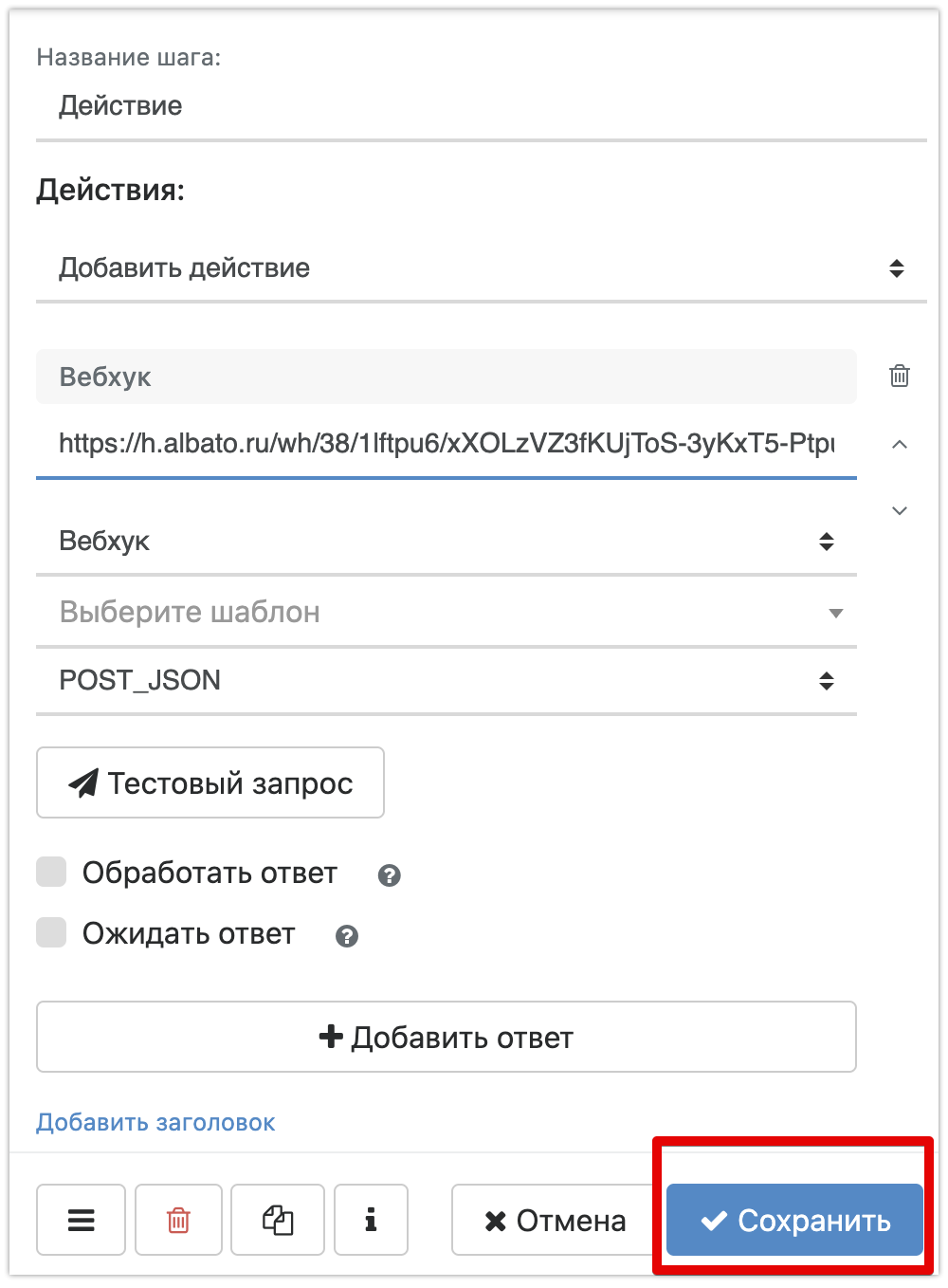 Добавляем шаг в боте с отправкой данных на вебхук: