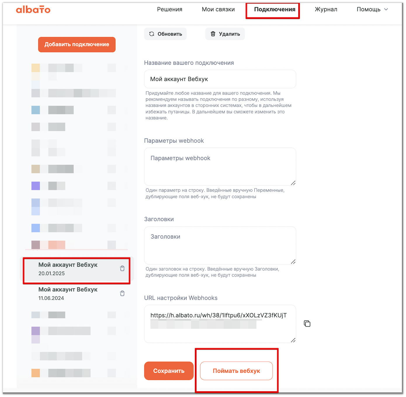 Теперь необходимо перейти в кабинет Альбато и в разделе Подключения — Webhook нажать на кнопку Поймать вебхук (либо также можно запустить ловец хуков из самой связки) и поймаем поля из сервиса Senler: