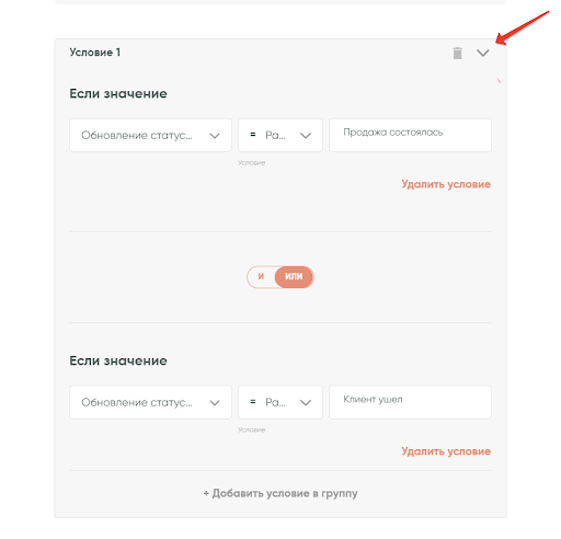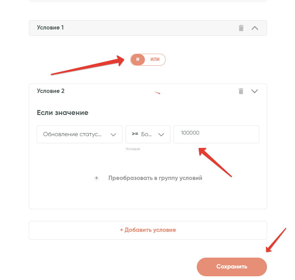 Допустим, вам нужно получать информацию только о крупных сделках с бюджетом более 100 000 рублей.Для этого к уже имеющейся группе условий добавьте еще одно условие. Для удобства можно свернуть первую группу условий с помощью кнопки в правом верхнем углу:
