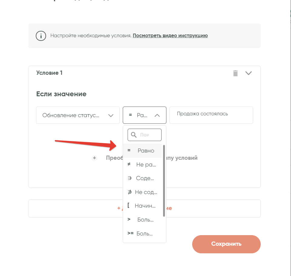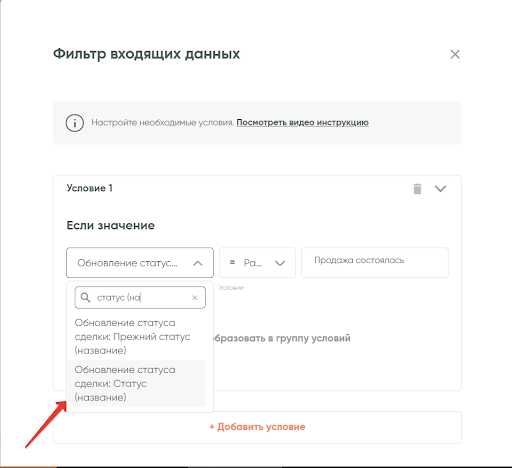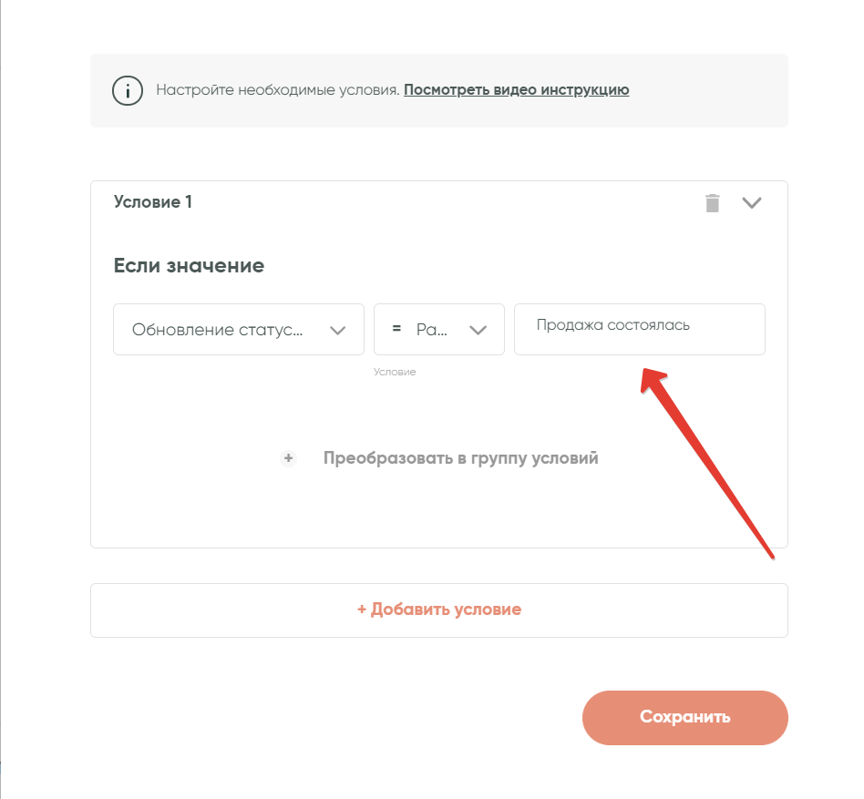 В третьем поле напишите название необходимого статуса сделки, по которому будет проверяться условие. В примере это статус «Продажа состоялась»: